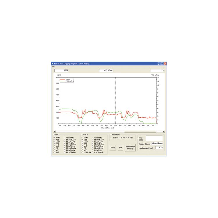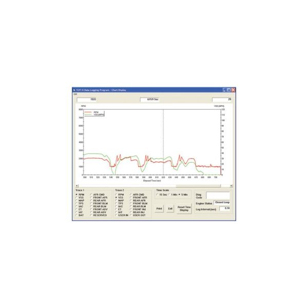 - User interface consists of up/down pushbuttons and bright LED display to select and change fuel trim and spark retard in RPM and throttle position ranges