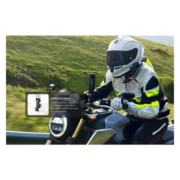 The Insta360 X5 is built to withstand the demands of motorcycle riding, with a rugged design and waterproof construction. The heavy-duty clamp mount ensures a secure attachment to your bike, while the protective pouch and lens cloth keep your camera safe when not in use.