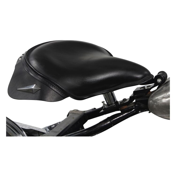 Replica black police solo seat with spears and leather skirt is on a factory steel ribbed baseplate. The seat features a genuine leather bottom strip as on original construction which features a natural color leather. Order mount kit separately for application.