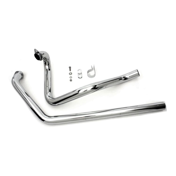 True dual exhaust system features completely separate exhaust pipes. Front and rear pipes function independently. Pipe set measures 1-3/4″ outer diameter. Pipes are chrome plated.