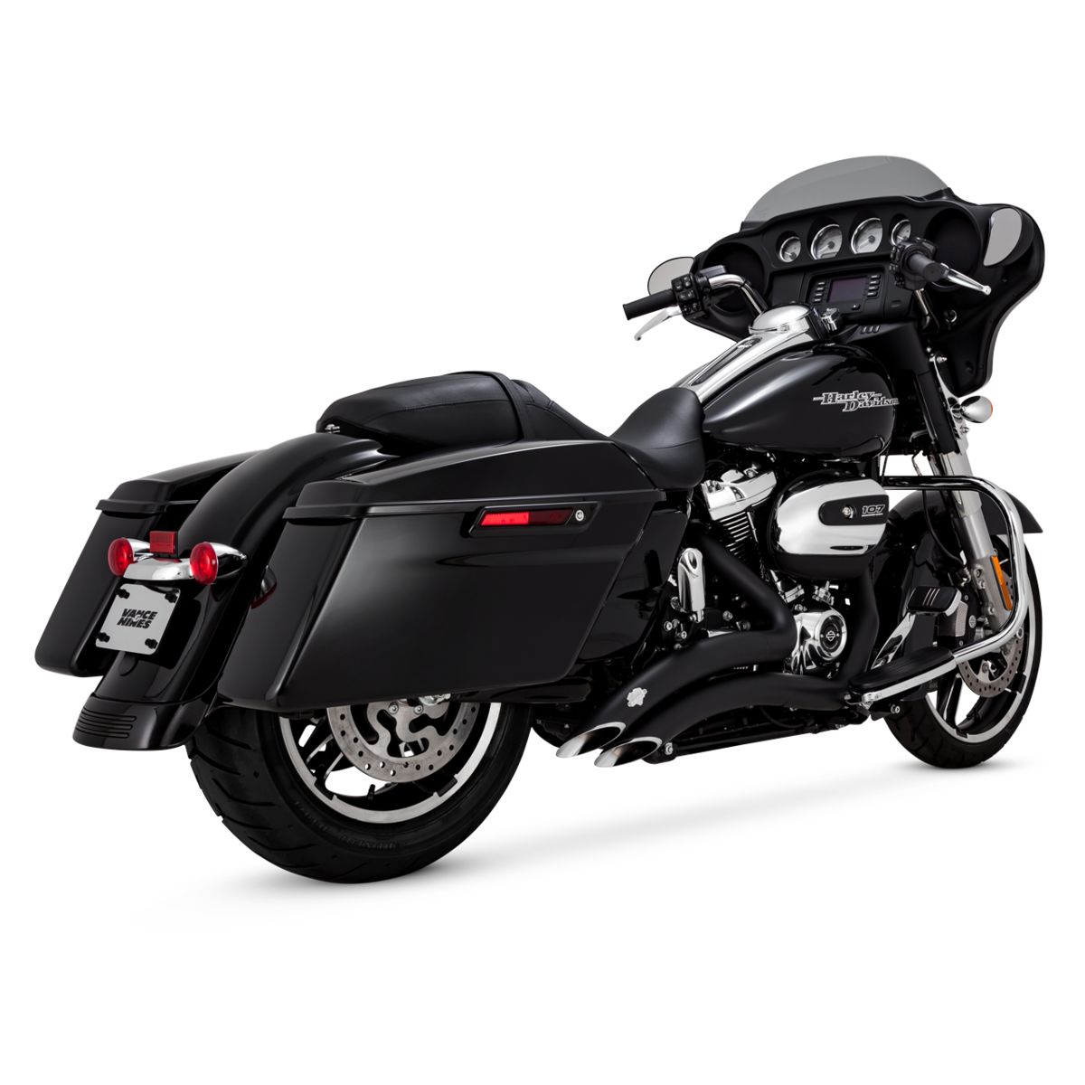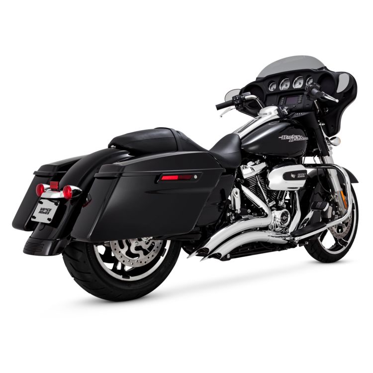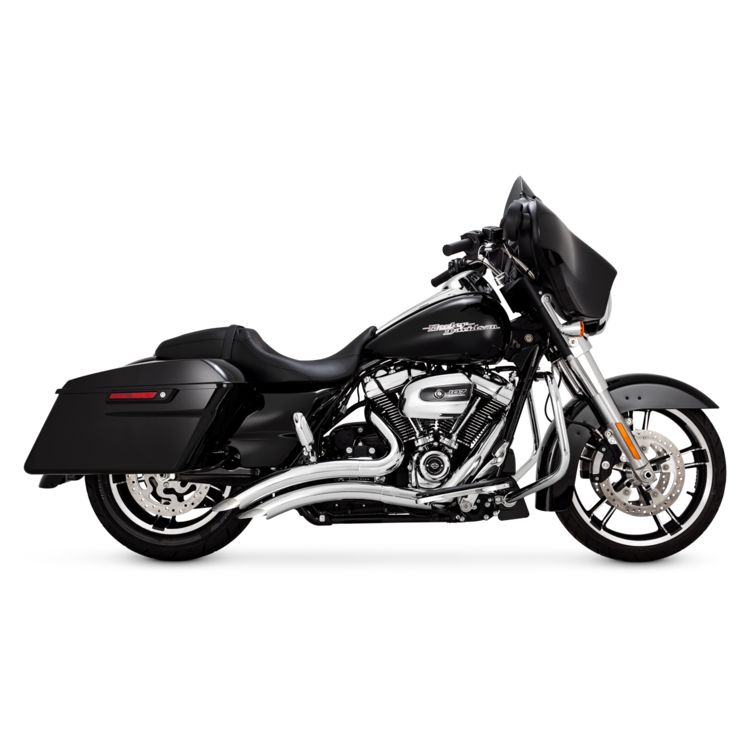 Packing style and sound into one quality set of pipes is what Vance & Hines Big Radius Exhaust does best. Manufactured using 16-gauge steel, these 1-3/4″ diameter pipes offer full-coverage heat shields and dyno-tuned, radius-covered louvered baffles to produce the rich, deep sound Harley-Davidson riders expect from aftermarket exhaust systems. Even better, these 2-into-2 pipes deliver extra horsepower and torque for your Touring model motorcycle.